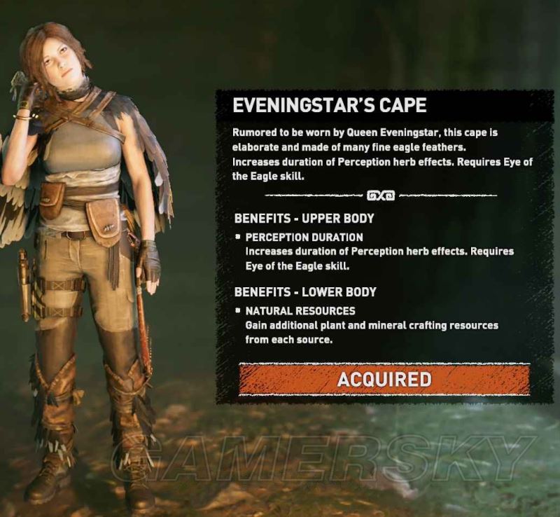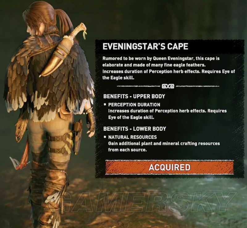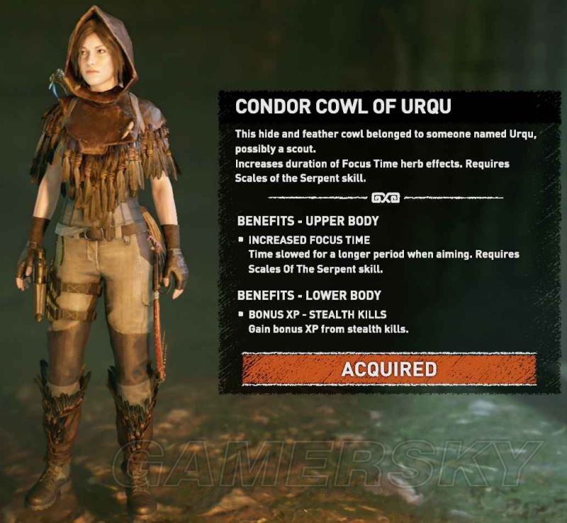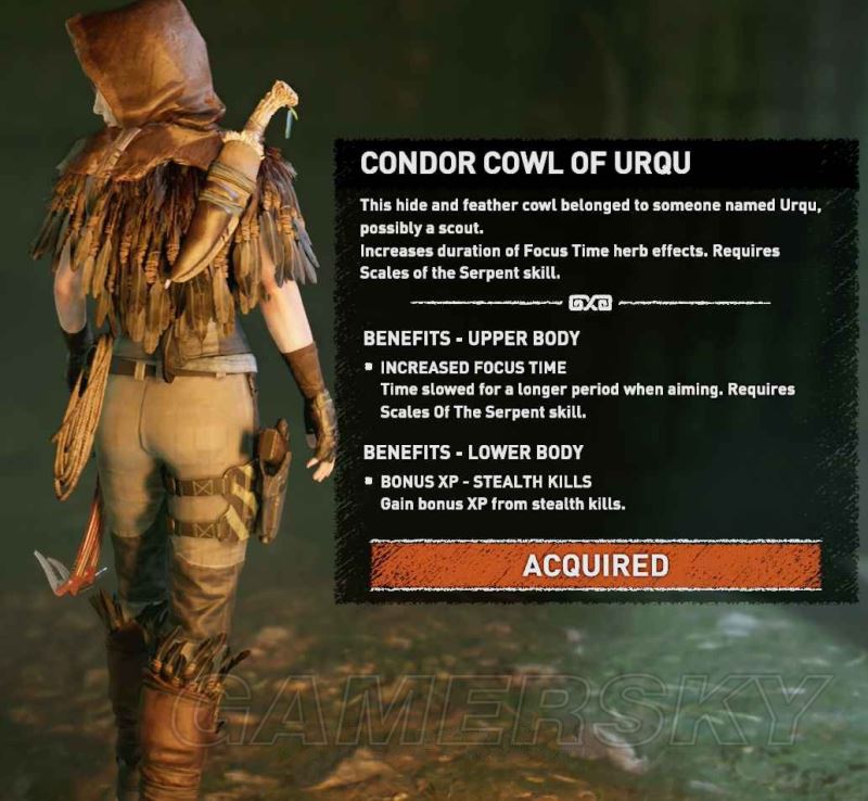 这个带羽毛的斗篷属于一个名叫Urqu的人,他可能是个侦察兵。能够增加Focus Time草药的持续时间,但是需要Serpent Skill的等级。