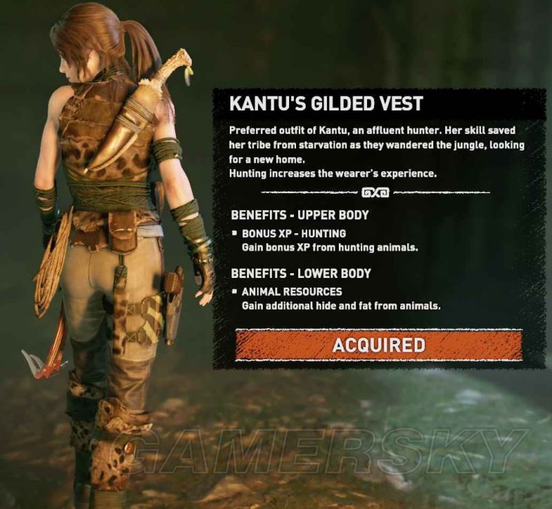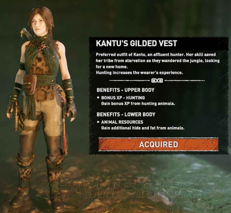 猎人Kantu的首选服装。她的技能使她的部落在丛林中游荡寻找新家时免受饥饿。