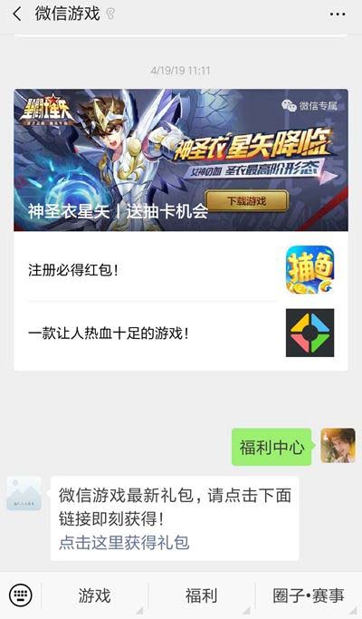 2、出现一个【微信游戏最新礼包,请点击下面链接即刻获得!点击这里获得礼包】,点击蓝色字体。