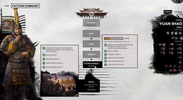 在战役模式中,玩家所在派系的初始声望等级为【士】。派系等级包括:士、伯、侯、公、王、皇帝,每升一个等级都会出现新的任务分配和更高等级的外交选项。