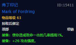 饰品:正义之手,出处为黑暗深渊的最终BOSS皇帝。这饰品特效配合盗贼的剑专精+人类的剑专精非常变态。一般来说有心的盗贼在进MC之前都会刷一个,这货掉率并不感人,4-5次左右就可以出货,这里特别说明一下,不少猎人也会觊觎这件饰品,所以如果你是盗贼并且是队长,请提前沟通。另一个饰品位是任务出品的:黑手饰物+2%暴击,人手一个。所以一阶段菜刀的饰品标配为:黑手+正义。