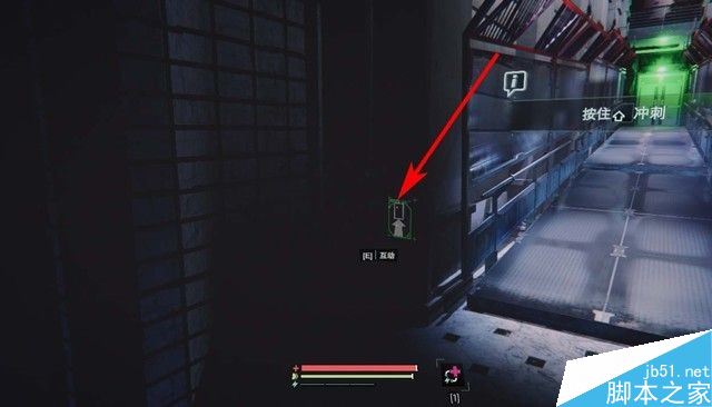 来到走廊,如下图箭头所指,门的左边是一个开关,按下开关,前面的门就会被打开。