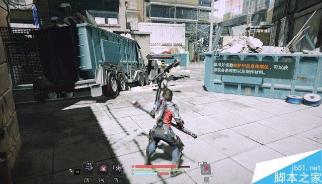 获得外骨骼之后,出房间,在柜子那会遇到一个拿长矛的敌人,按鼠标中键锁定目标,使用滚轮切换部位,将攻击部位锁定在手部,然后攻击他,敌人残血之后,会出现切割提示(默认E),按住E就能将敌人手部切割下来,因为这个敌人拿着武器,所以,手臂被切割下之后,你就可以获得该武器了。