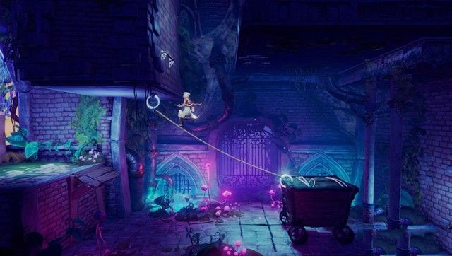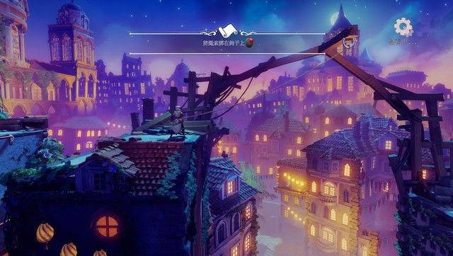 继续前进,游戏提示你,可以将两个钩锁相连组成一座桥,利用钩锁桥可以通过这里。这里是将上面的钩锁和矿车上面的钩锁相连。
