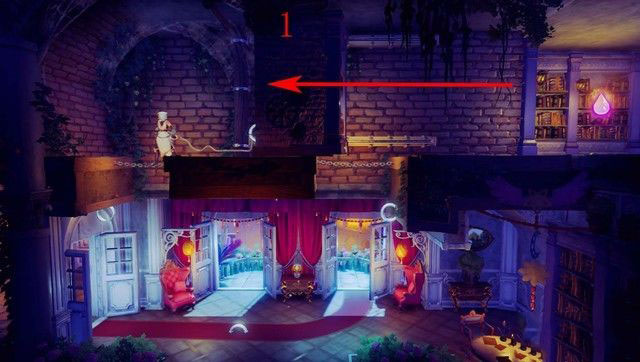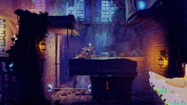 来到庭院,射击上面的气球,射掉两个之后,就能将杠杆放下,随后,你就能爬上去了。