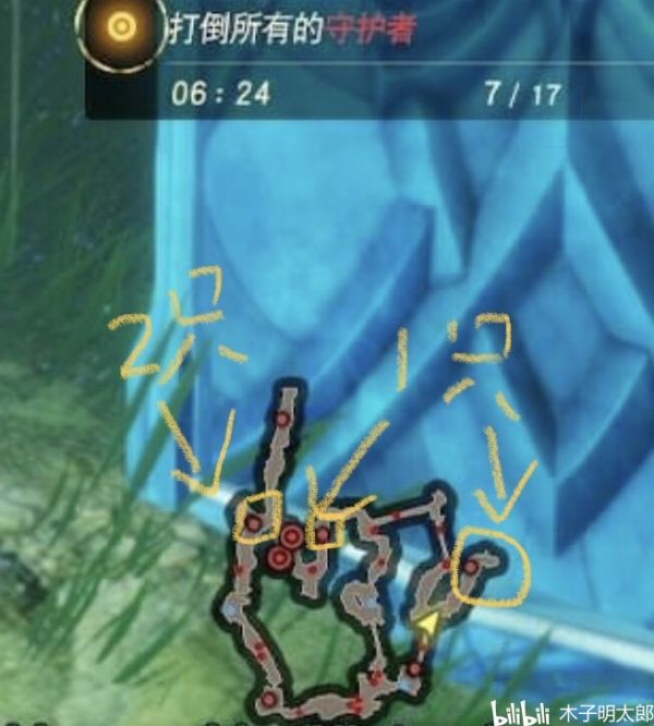 注意打一定数量的守护者后,任务阶段会变成第二阶。增加守护者数量,打倒17只守护者。而关键就在的第二张地图里。有这几只守护者是不动的。这3只是无论如何都要过去打死的。打一下跑走也是吸引不了的。超级恶趣味。最顶上(左上)与右下角 不是还各有一只吗,这俩在第二阶段也不动的。如果跑图会跑死。但第三阶段会开始跟随玩家。恶趣味爆炸了,这任务就不可能一次过。【当然不同的走法可能守护者跟随情况会有些不同,我没有完全测试(最近完全不想再打了)】