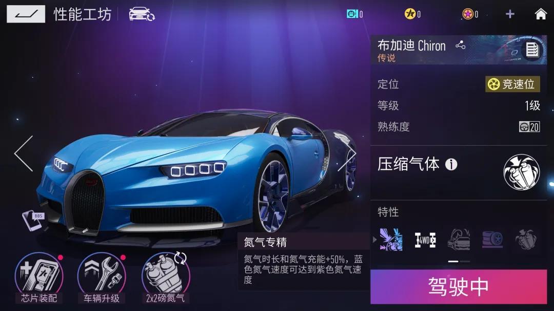布加迪Chiron的被动技能“氮气专精”,使其氮气时长和氮气充能+50%,蓝色氮气速度可达到紫色氮气速度。彪悍的性能让其到达前所未有的极速巅峰,为其带来无限的可能。