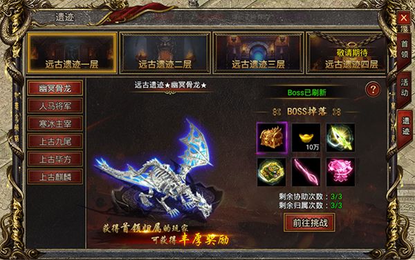 兄弟们可以在右上角的【首领挑战】中找到远古遗迹页签,远古遗迹玩法在开服第2天开启,击杀遗迹内的BOSS会获得丰厚奖励,并有机会获得极品装备,BOSS等级越高,奖励越好!