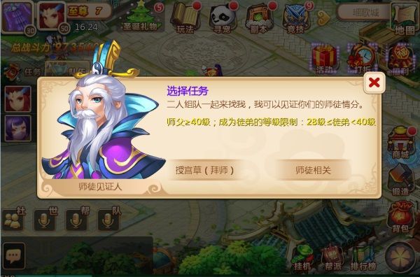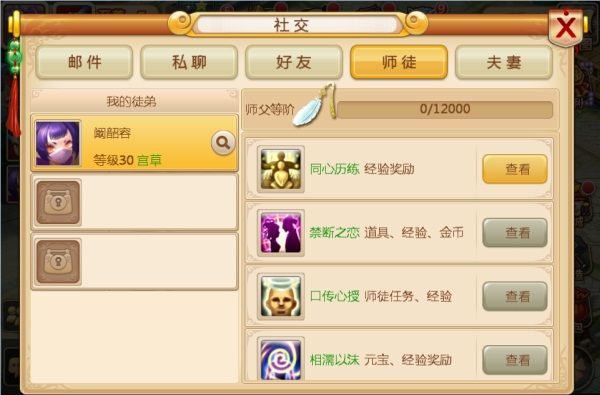 玩家们达到28级以后,就能选择自己的恩师啦。当然,师父必须不小于45级。“师父虽好,但不能贪多哦!”每个徒弟只能有1个师父。每当徒弟完成了师父发布的任务,或是师徒二人共同完成日常,就可以使得当天原有的经验道具奖励UP!