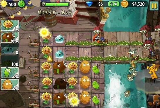 这里我再种向日葵的原因是想尽早生产出更多的阳光,当然大家也可以把能量豆用在向日葵上让其爆发更多的阳光,然后尽早把椰子加农炮放满3个,前面有坚果挡着。