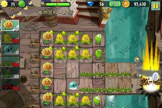 这一关系统是给的固定植物,而只要玉米和地刺是攻击植物,不过对付这一关也足够了。开场用冰冻生菜冻住第一只僵尸,然后快速把向日葵种满一排。然后开始种地刺,一定要快速的种地刺,因为一个地刺并不能杀死一只僵尸,至少要2个地刺才可以。