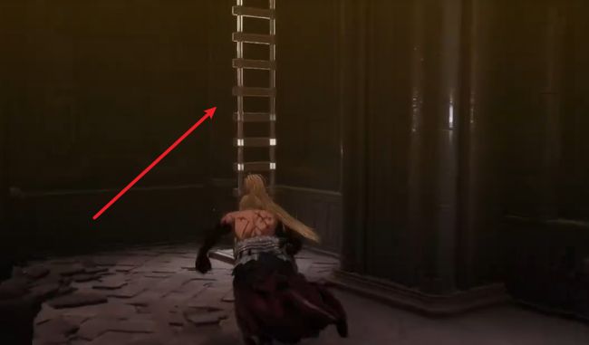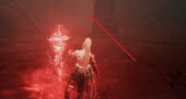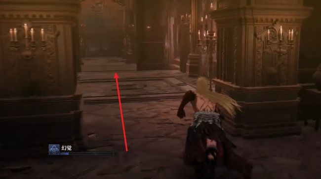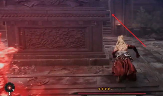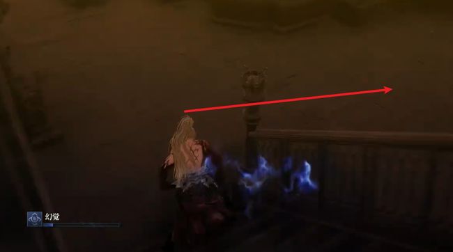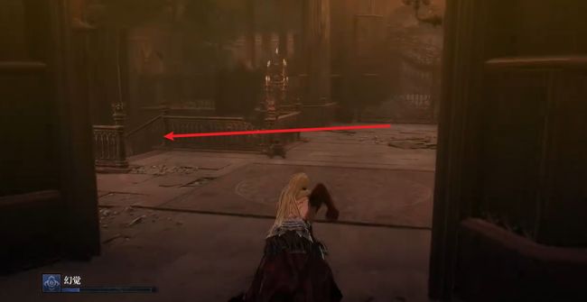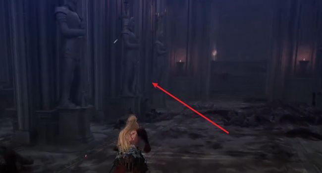 3、登上楼梯后,在上方平台的左侧三个雕像的位置左转。