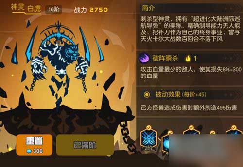 10阶——破阵瞬杀使用后,己方怪兽攻击力增加25%,持续15秒。加攻击力的BUFF,好处不用多说。