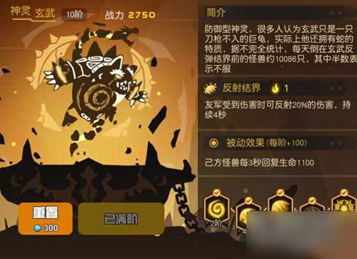 第三个解锁的神灵,上古神龟的保护能力可不是盖的,反伤盾是它的拿手好戏,20%(满阶30%)的反射伤害使那些脆皮输出瑟瑟发抖。