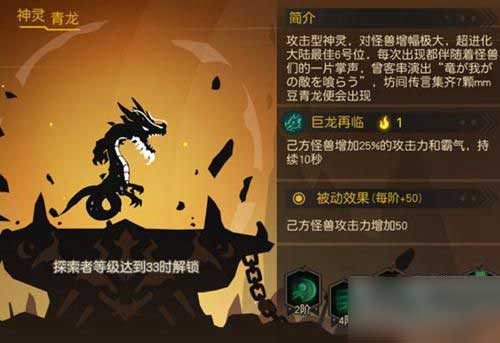 探索者33级解锁,攻击型神灵,对己方怪兽增幅极大,有了青龙坐镇的怪兽军团,无异于如虎添翼。