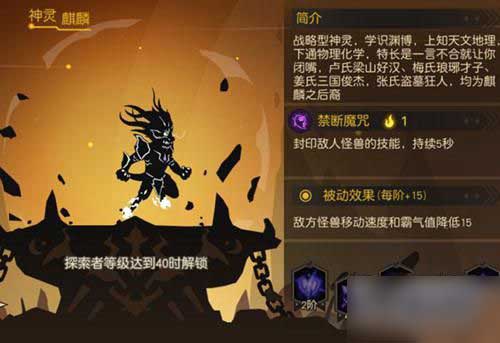 麒麟是一个整体战略型的神灵,它可以削弱敌方的整体战斗力。40级解锁,因此也有一种说法:这游戏40级之后才是真正的开始!