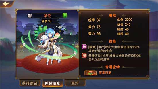 提起医术和三国,相信大家都不会忽略了三国时期著名的神医华佗,无论是麻沸散,还是青囊书,无一不显示其高超的医术,那么在放开那三国2中,华佗自然会延续他的高超医术,奶量惊人。