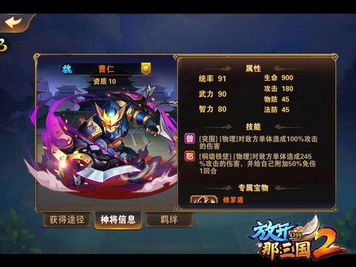 接下来说说曹仁的羁绊,他的羁绊中需要着司马昭和曹植这两名紫将,说起来满坑的,要上阵的话只能放弃这30%生命和20%的攻击了。但是其他三个羁绊还是不错的,都是12资质武将和红将,说明上阵潜力还是巨大的。