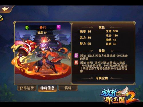 费祎跟之前的庞统一样,都是定位为法师,而且也是一个灼烧流的武将,因此同样也不太适合现在的蜀国阵容。要是上阵的话只能是徐庶,庞统和费祎三者配合了,徐庶先打出易伤,然后费祎放火,再是庞统放火,费祎的放火能配合庞统的特性10,如果后期配合好怒气将,庞统有希望能连续放大。(PS,不要期待诸葛火烧流,其实诸葛技能在塔里面有了,普攻是群体攻击,大招是群攻,几率石化,除非后期改变)特性说实话不好,蜀国是秒人流不假,但是法师系的并不能秒人,凌弱和峙强都不一定能发挥,急救倒还是不错,配合蜀国回血。