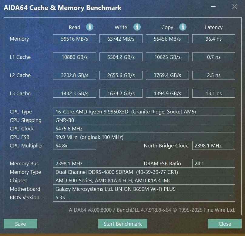 这个成绩非常均衡,尤其是内存拷贝速度和内存延迟表现都比较优秀,看来影驰联盟 B650M Wi-Fi 黑武士 PLUS 主板对于内存性能的优化相当到位。其实这块主板最高支持 7600+ MT/s 的内存频率,因此内存超频的潜力也非常大,只不过 AMD 平台这边 6000MHz 依旧是内存频率的甜蜜点,因此超频部分就不再做具体展示了。