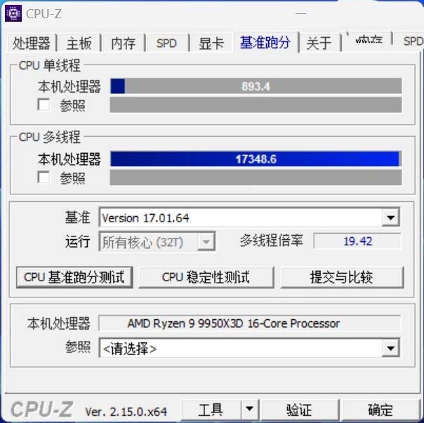 - 锐龙 9 9950X3D 处理器默频模式下单线程得分 893 分,多线程得分 17348 分;