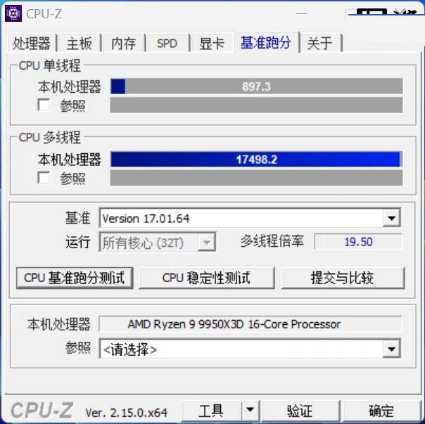 - 锐龙 9 9950X3D 处理器 PBO 模式下单线程得分 897 分,多线程得分 17498 分。