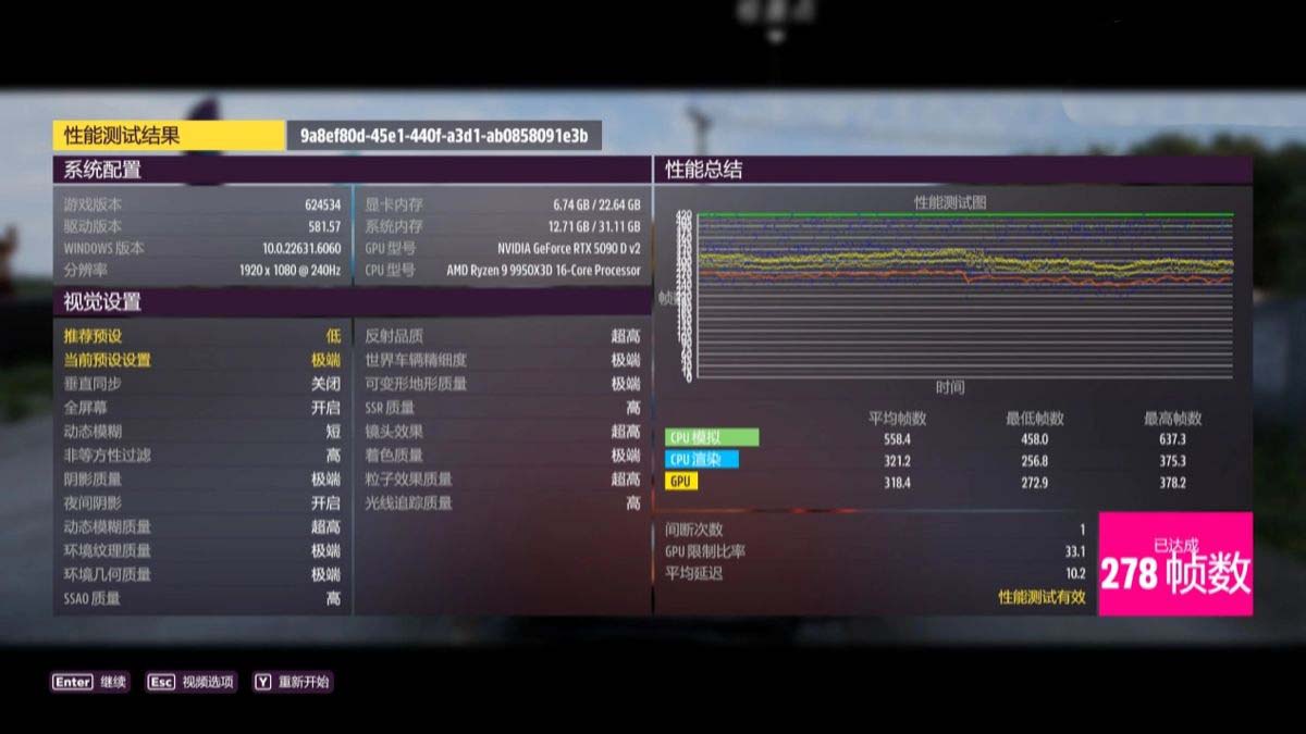 第四款游戏《极限竞速:地平线 5》,以 1080P 分辨率 + 极端画质预设,运行游戏自带基准测试,游戏平均帧数为 278 帧。