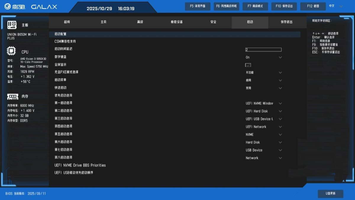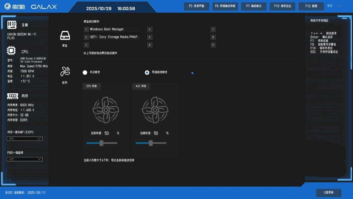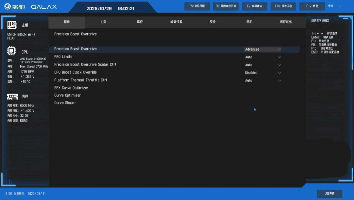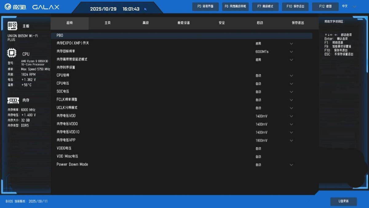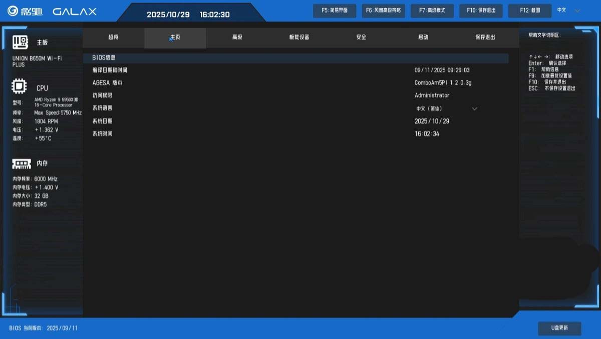 影驰联盟 B650M Wi-Fi 黑武士 PLUS 主板的 BIOS 可视化界面,采用了蓝黑撞色设计,背景主色调是黑色,蓝色则是强调色,文字采用白色,整体的视觉可读性不错,UI 也比较简约。