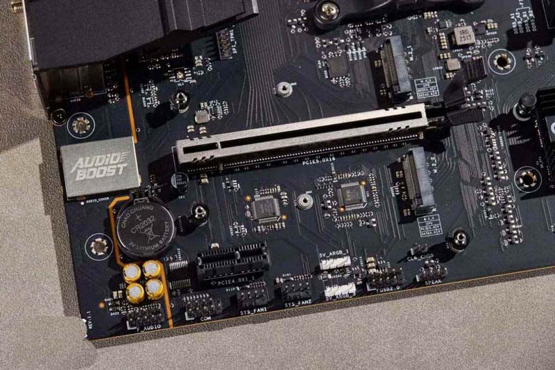 CPU 下方提供 1 条带有铝合金加固的 PCIe 5.0x16 显卡插槽,上下各有 1 条 PCIe5.0 M.2 插槽,再下方还有 1 条 PCIe 4.0x1 插槽,支持连接声卡等扩展件。右侧最下方还有第 3 条 PCIe 4.0 规格的 M.2 插槽,同时还保留了 4 个 SATA 接口,存储扩展性到位。
