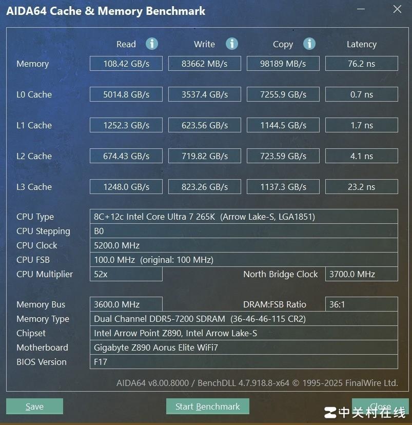 能够看到技嘉 Z890 AORUS ELITE WIFI7 小雕主板开启Intel® 200S Boost后内存性能进一步上涨,对比常规模式读取、写入、复制以及延迟都有一定的进步,因为这项技术一定程度上提升了CPU频率,增强缓存之间的数据传输效率。