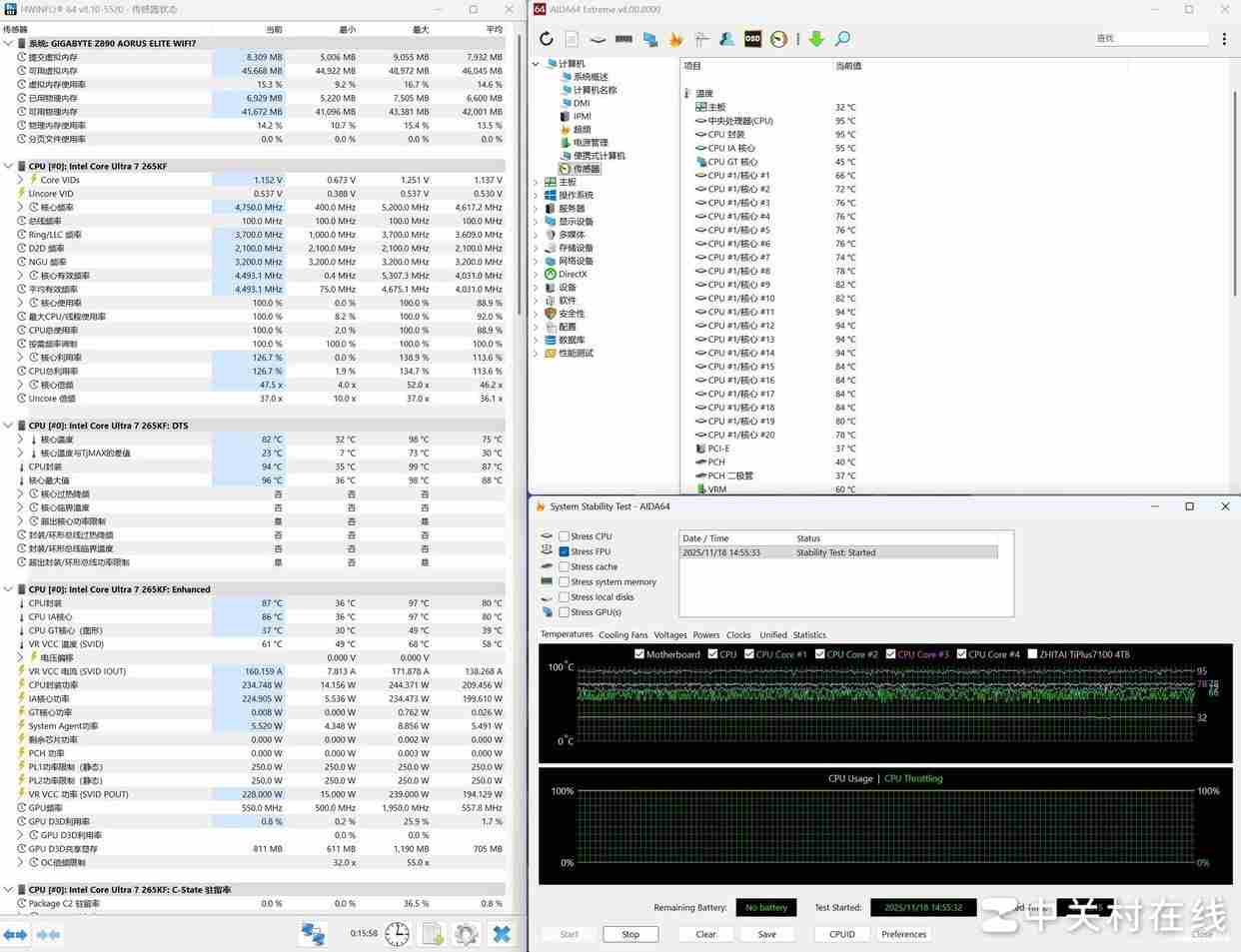 Intel® 200S Boost开启后,酷睿Ultra 7 265K频率有了变化,平均CPU频率达到了4.73GHz左右,D2D直接提升到了3200MHz,目前D2D在很多B860主板上是锁住的,Z890能解放其性能上限。此时CPU封装平均温度来到83℃,CPU平均功耗在221W左右,确实提频会让CPU整体负载加大,但依旧在健康范围内,对于技嘉 Z890 AORUS ELITE WIFI7 小雕主板完全没有压力。