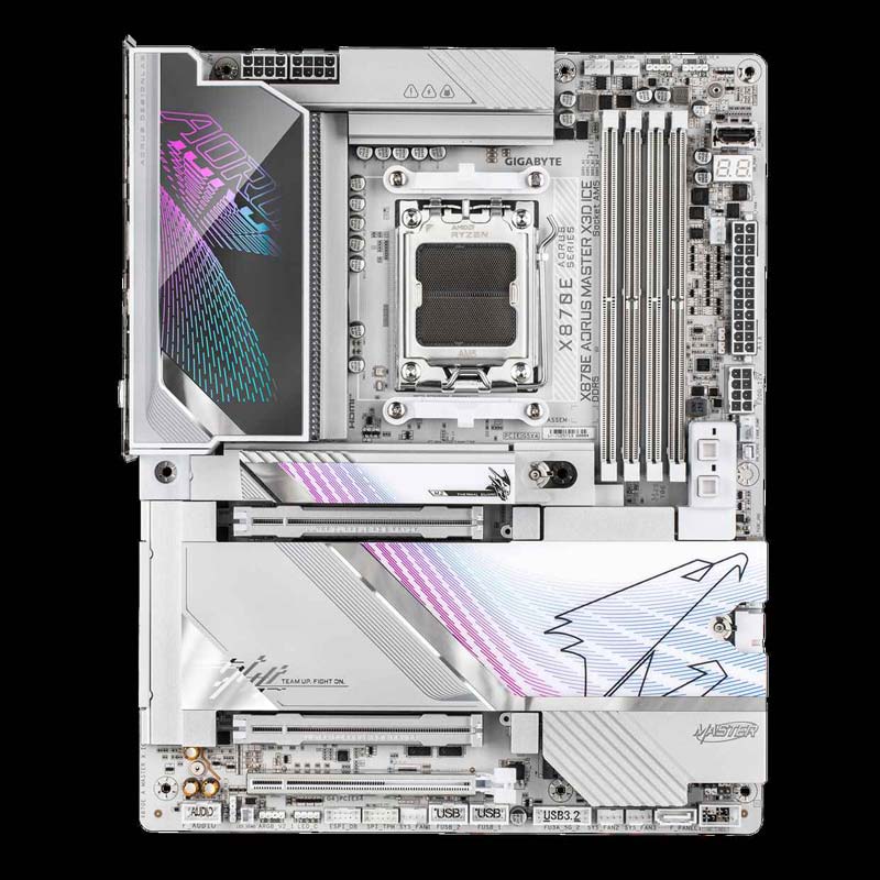 X870E X3D超级冰雕是技嘉新发布的旗舰产品,ATX板型,通体银白配色,甚至内存插槽和PCIE插槽也细致的喷了白色,散热片有着大量镭射反光淡紫色纹理,供电散热片还有RGB像素屏,层次感和辨识度都是相当高的。
