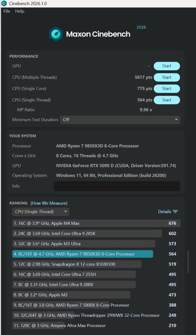 CINEBENCH 2026测试中,七彩虹X870E火神主板的套装的单线程成绩为564、单核心成绩为775,多线程成绩为5617。