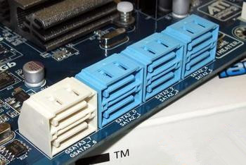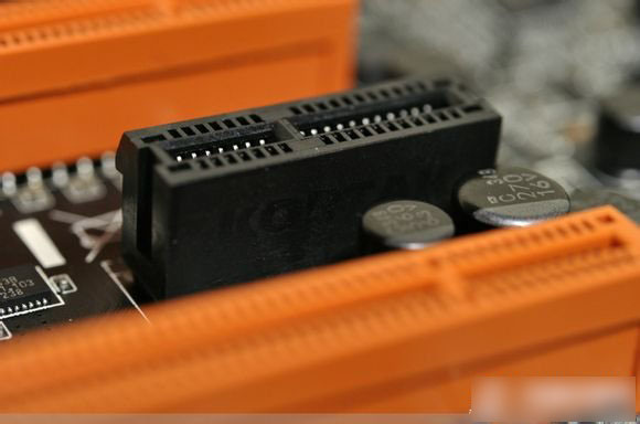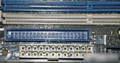 此图为内存插槽下面的蓝色和白色的接口,即IDE接口和主板整体供电接口,一般是24pin。IDE接口,目前已经退出市场。