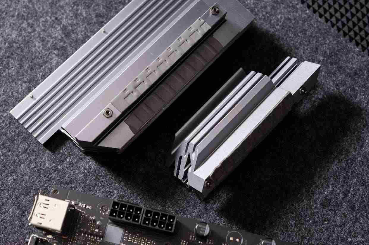 PCIe插槽之间是两块结实的散热装甲,它们之下隐藏的就是这块主板的M.2固态硬盘插槽了。
