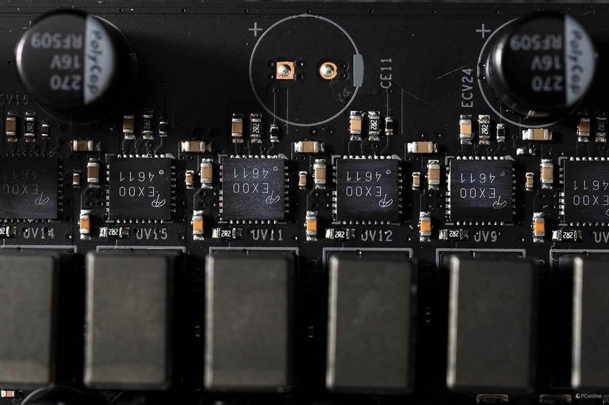 DrMos方面,每相供电均独立配置,芯片丝印型号为EX00,实际型号为AOZ5510QI,是一款支持55A的Dr.MOS,与蓝宝石其他主板供电规模一样。