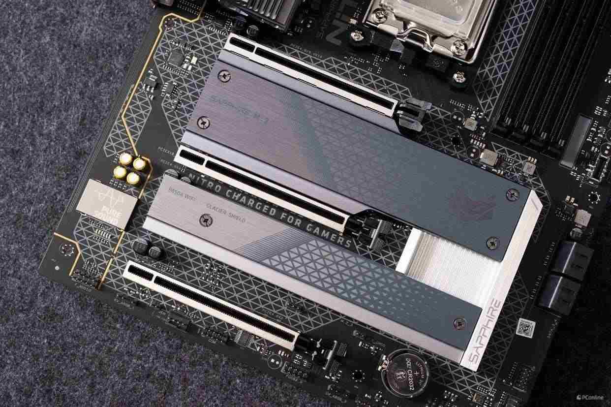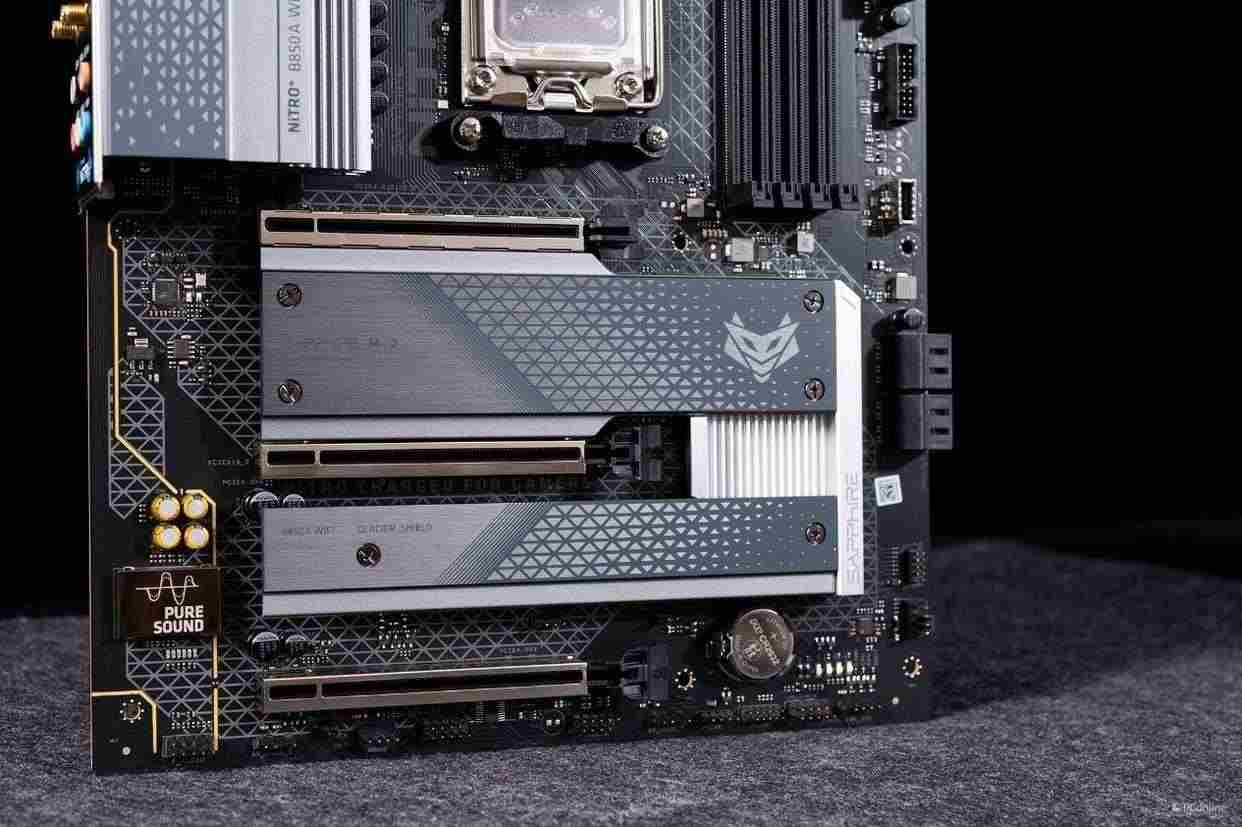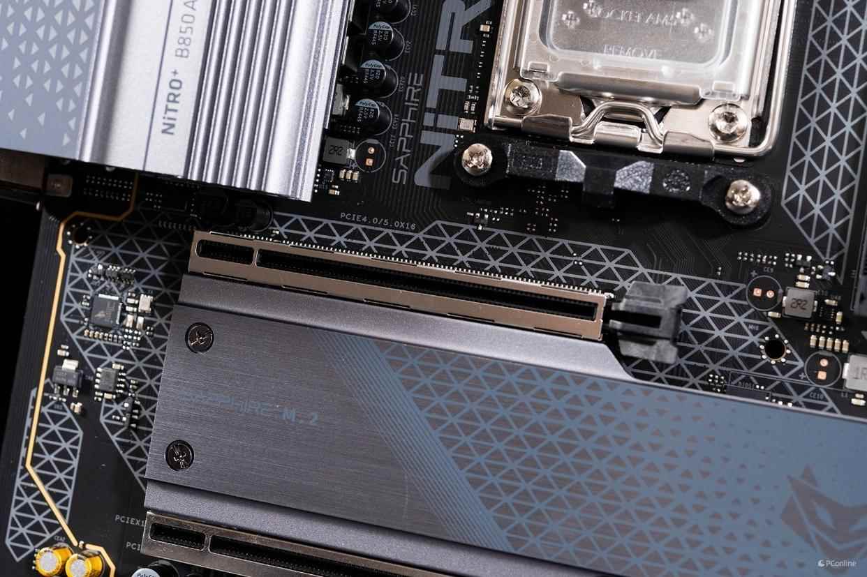 蓝宝石 NITRO 氮动 B850A WIFI 主板提供了三根PCIe全尺寸插槽,带宽分配上,顶部的PCIe插槽由CPU直接提供PCIe 5.0×16带宽,中间的PCIe插槽由B850芯片组提供PCIe 4.0×4带宽,最后一根PCIe插槽则支持PCIe 4.0×2带宽,基本可以满足各类I/O设备的拓展需求。