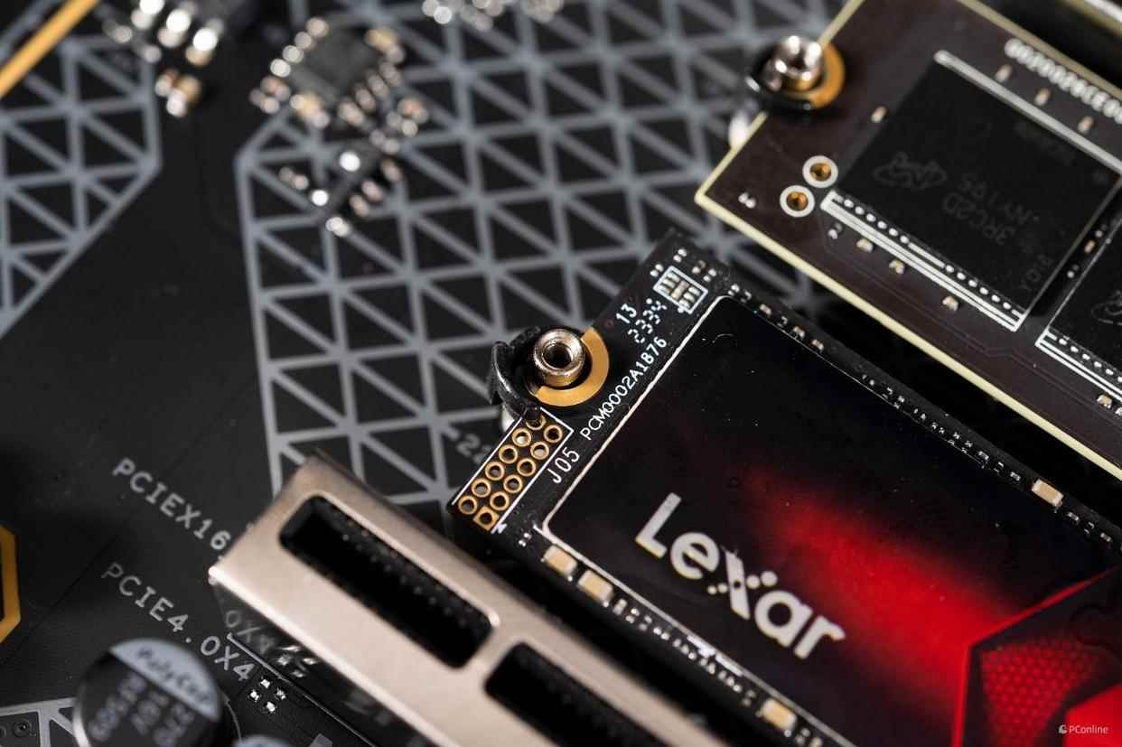 三个M.2固态硬盘插槽如下所示,其中靠近CPU底座的一组为PCIe 5.0×4标准,剩下的两组则是PCIe 4.0×4标准。