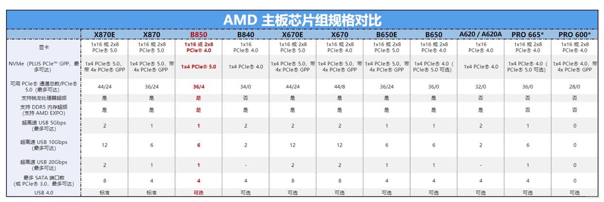 我们先来看看新的B850主板芯片组详细规格。作为一款主流级别的芯片组,AMD B850的规格无疑能够充分满足大多数用户的需求:1.它支持处理器与内存的超频;2.PCIe插槽与M.2固态硬盘插槽均支持最新的PCIe 5.0规范;3.原生提供USB 3.2 Gen2 x2 20Gbps接口;4.芯片组内置8条PCIe 4.0通道与4条PCIe 3.0通道。配合其合理的价格,主板制造商能够打造出性价比高、扩展性能出色的千元级别主板。