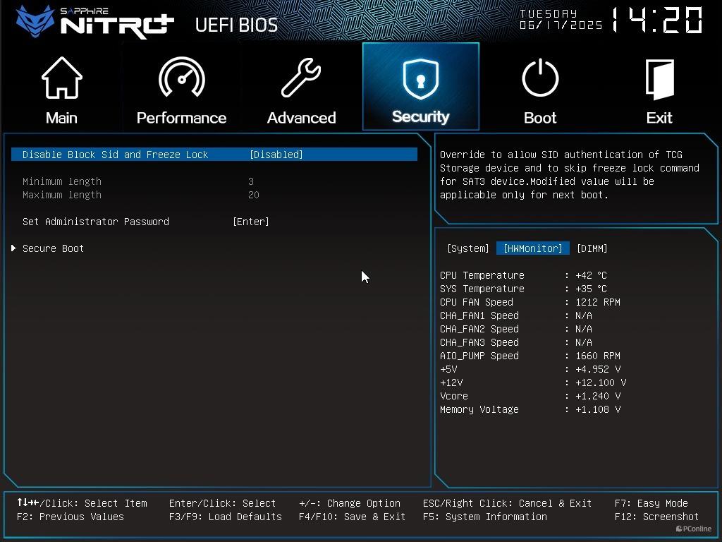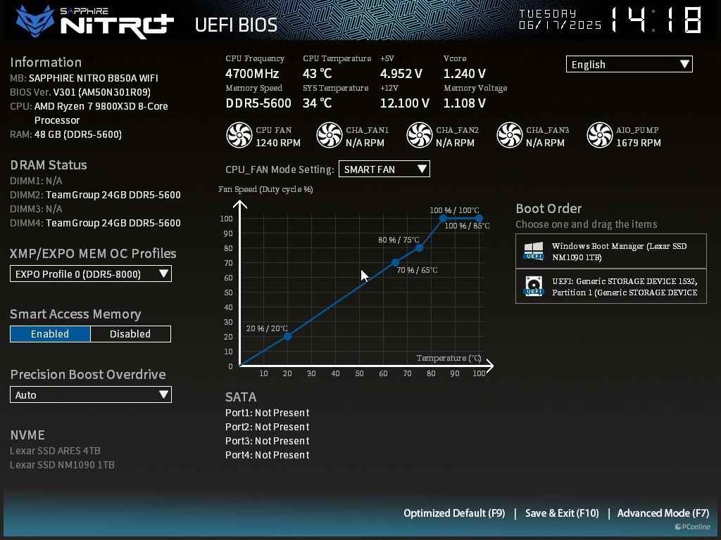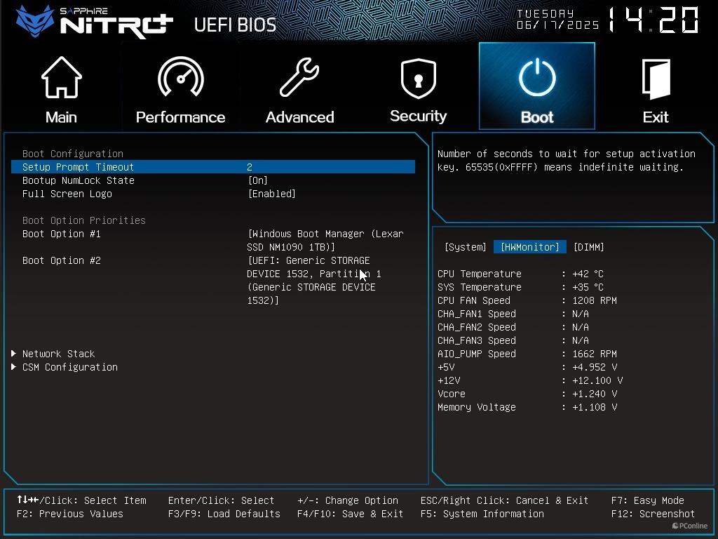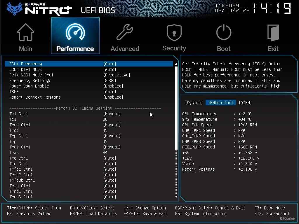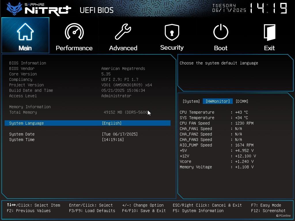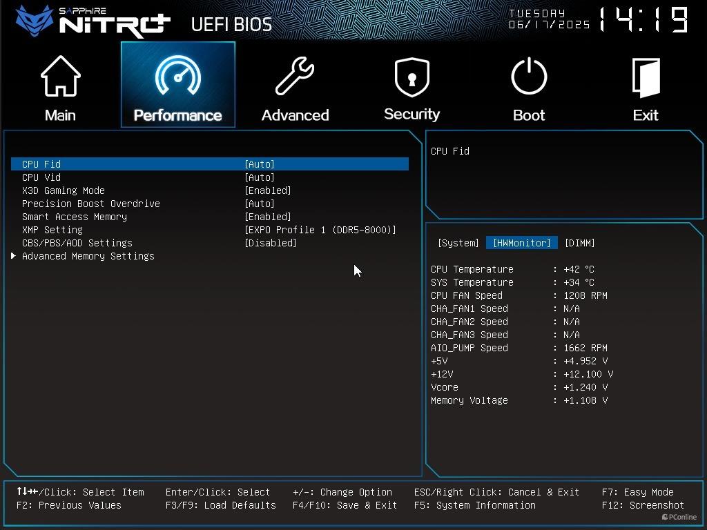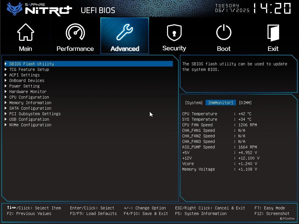 接着我们再看看主板的软件部分,没错就是BIOS!不难看出蓝宝石为不同系列的主板设计了专属的UI,例如我们手上的蓝宝石 NITRO 氮动 B850A WIFI主板则是主打暗黑的电竞风格。