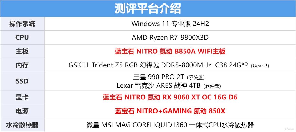 其中主板跟处理器分别是蓝宝石 NITRO 氮动 B850A WIFI主板以及AMD Ryzen 7-9800X3D,并且在测试过程中我们会开启BIOS中的X3D游戏模式,确保最佳的性能释放。