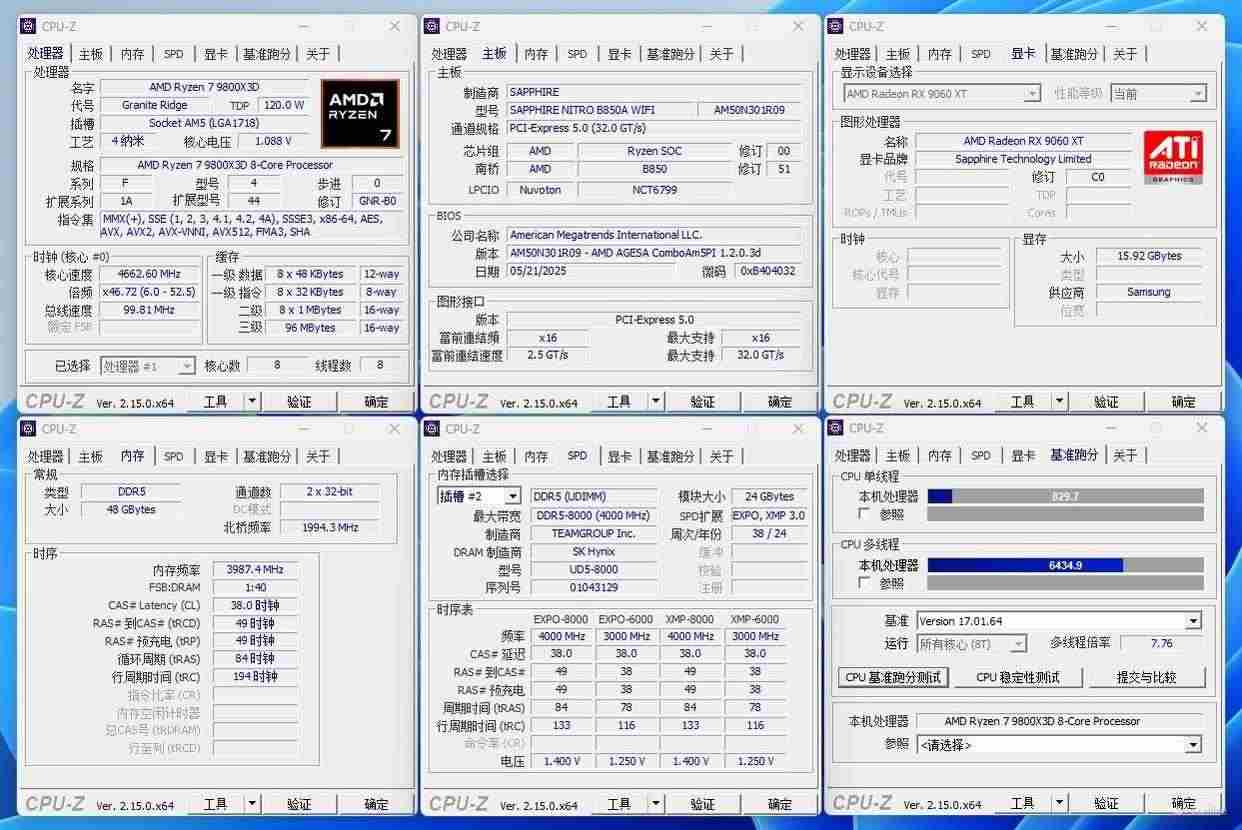 CPU基准测方面,实测9800X3D跑出了单核829.7,多核6434.9的成绩,这个成绩甚至比一些X870平台还要高,看来蓝宝石 NITRO氮动B850A WIFI确实性能出色,完全能够胜任带动9800X3D的重任。
