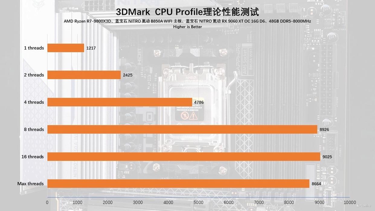 最后是3DMark CPU Profile测试,这项测试可以更精准的测试CPU在单核与多核方面的性能表现,实测9800X3D的单线程分数为1217,最大线程分数为8664,表现不错,作为一款专为游戏而生的CPU,这个成绩已经完全能够满足主流用户的需求了。