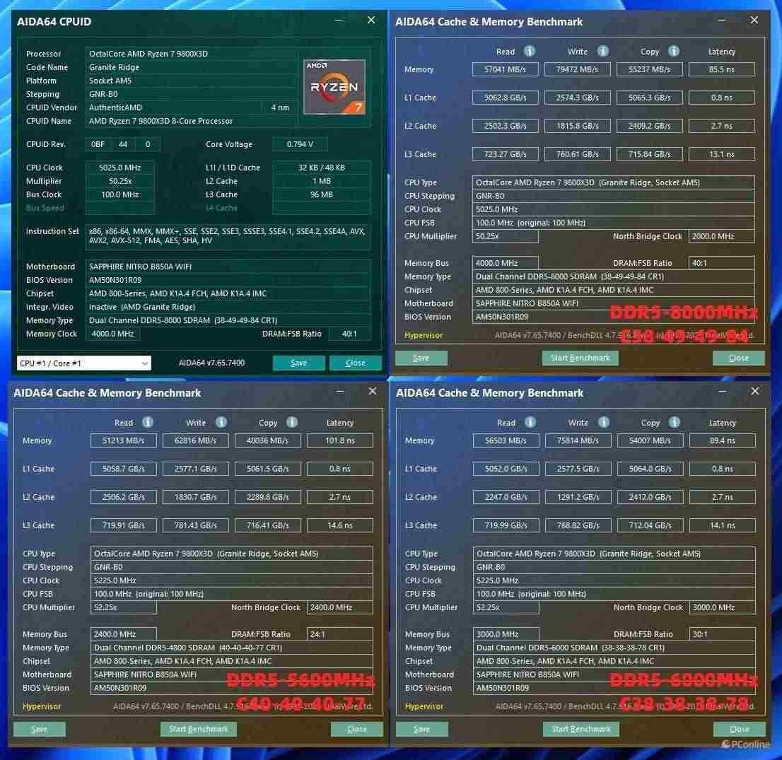 紧接着,我们针对蓝宝石 NITRO 氮动 B850A WIFI 主板内存兼容性和性能表现进行测试,我们分别测试了默认JEDEC-5600MHz、EXPO-6000MHz以及EXPO-8000MHz的表现。