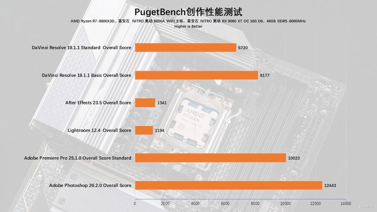 理论性能过后,就来到了我们的创作性能实测环节。首先是影像创作环节,这里我们使用PugetBench进行测试,这里涵盖了Photoshop、PR、AE、LR等大家常用的Adobe软件,能够真实的模拟用户的使用场景,得出的成绩也更接近实际体验。实测在蓝宝石NITRO氮动B850A WIFI主板这套平台上,无论是简单的图像处理还是压力较大的视频剪辑与渲染层面,都有不错的成绩表现,如果你是一名创意工作从业者,这套平台绝对能满足你的工作所需。