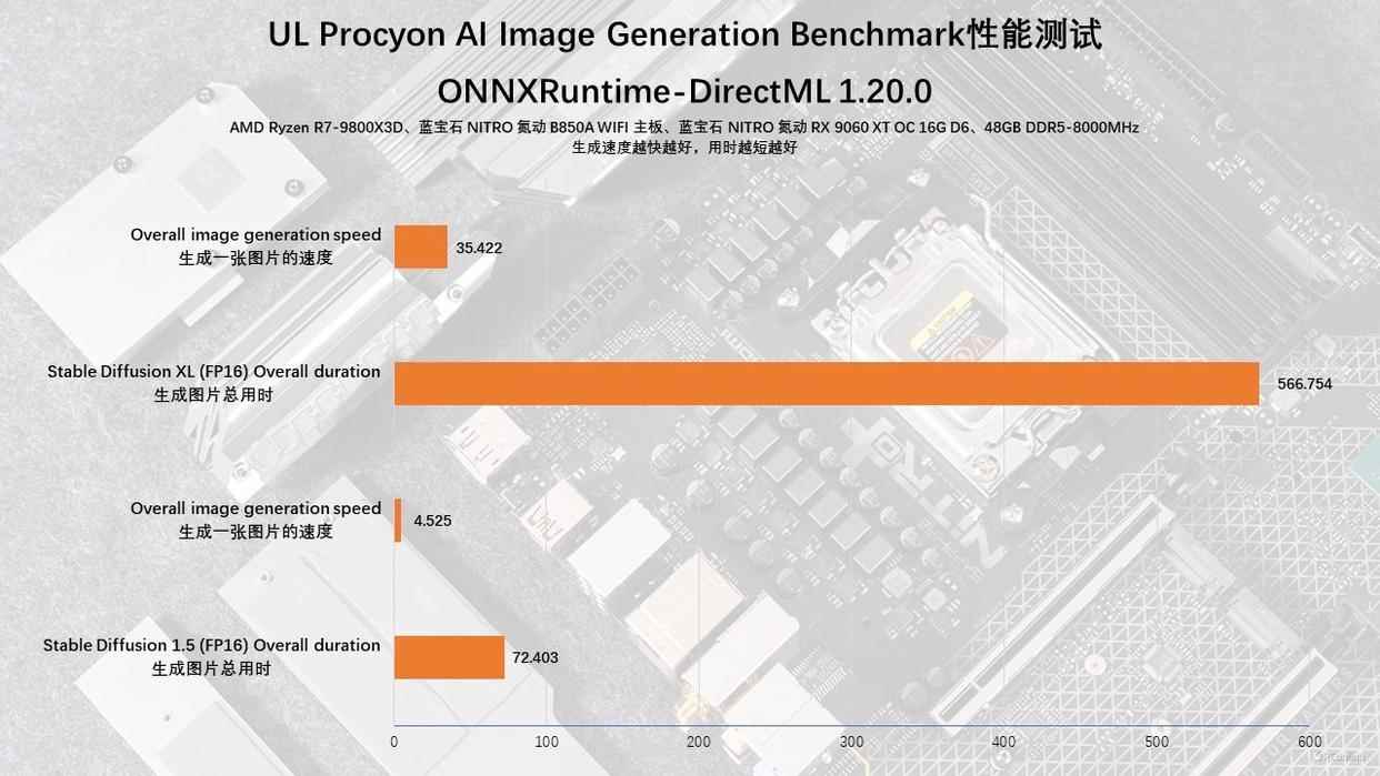 看过了基本的创作测试,我们再关注一下AI方面的表现。首先是AI文生图方面,以蓝宝石NITRO氮动B850A WIFI主板组建的平台,能够在SD1.5中实现4.525秒/张的出图能力,而在显存开销更大的SDXL中,凭借蓝宝石 NITRO 氮动 RX 9060 XT OC 16G D6更大的显存配置,生图速度则是35.422秒/张,表现也不错。