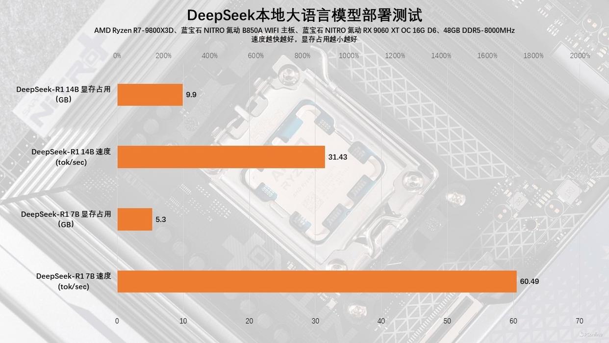 本地AI大模型部署上,蓝宝石NITRO氮动B850A WIFI主板也能提供不错的平台基础,这里我们以DeepSeek-R1 7B以及14B两种参数的大模型进行测试,这套平台搭配9800X3D以及蓝宝石 NITRO 氮动 RX 9060 XT OC 16G D6,运行起来可以说是丝滑流程,回答问题时速度也非常快,完全可用。