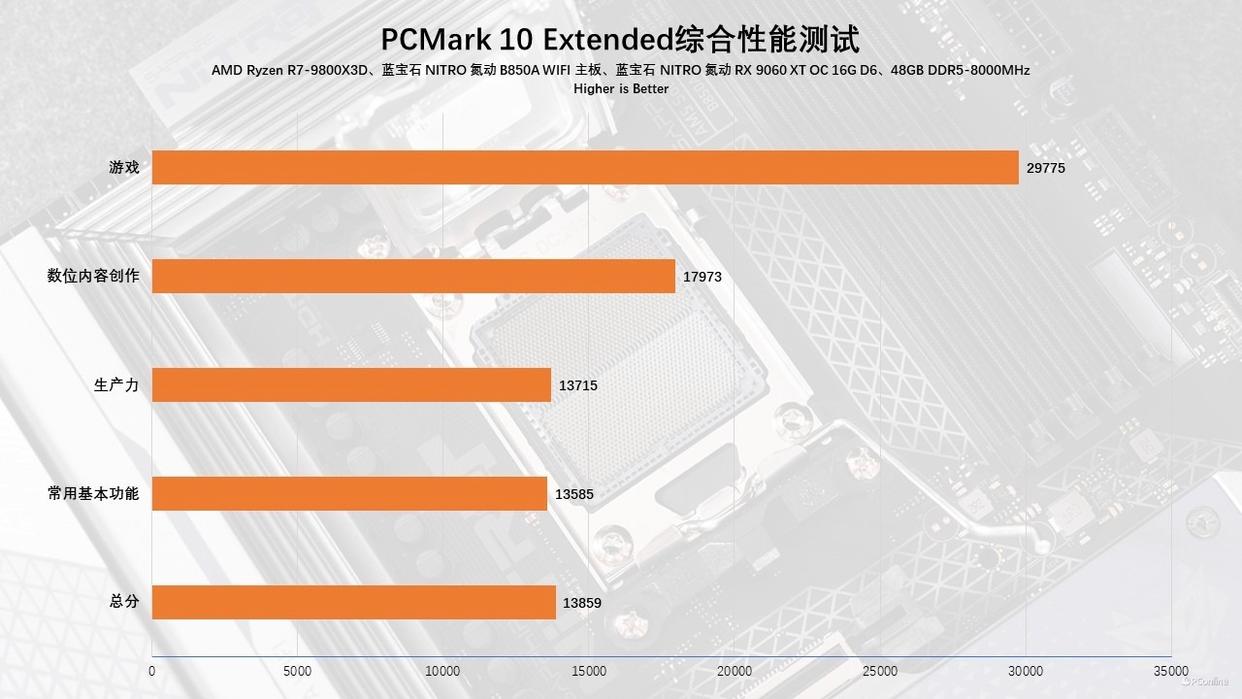 实测这套以蓝宝石NITRO氮动B850A WIFI主板为核心的平台在性能测试中取得了相当出色的成绩,总分为13859,其中常用基本功能得分为13585,生产力方面为13715,数位内容创作高达17973,而在游戏性能测试中更是达到了29775分。这一优异表现得益于Zen5架构的创新设计以及先进的5nm制程工艺所带来的强大性能提升。与此同时,搭配一块性能强劲的显卡(如蓝宝石 NITRO 氮动 RX 9060 XT OC 16G D6),也能使整个电脑平台的运行体验更加流畅和出色。