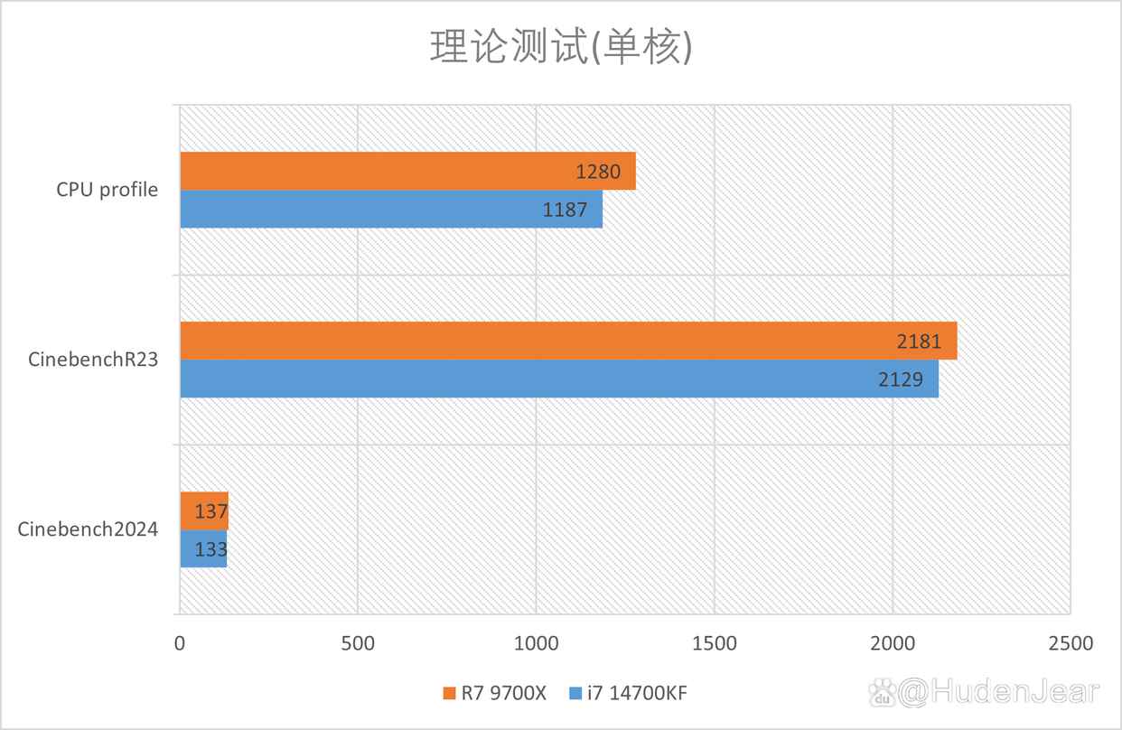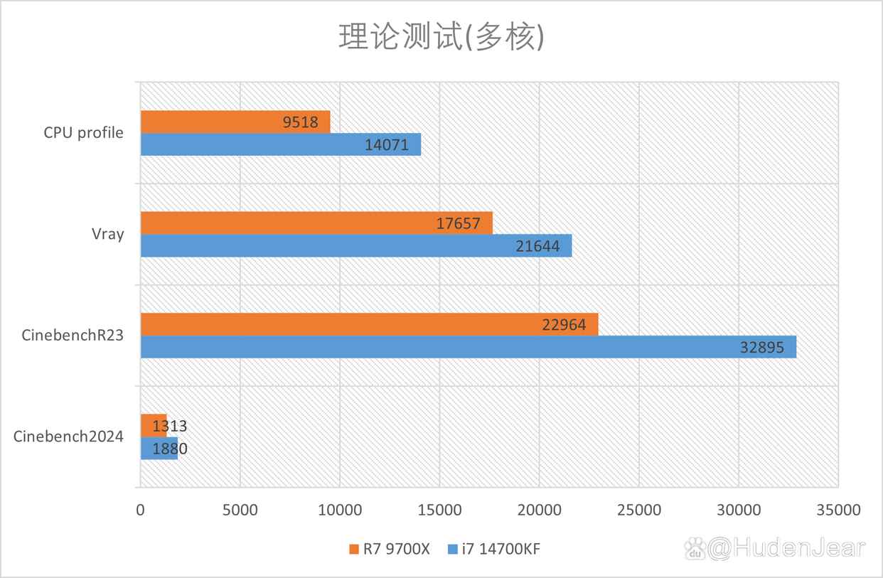 首先是理论性能的测试,多核上14700KF毫无疑问是占优势的,毕竟是8P+12e的构架,小核给i7把多核的尊严给守护住了。但是到了单核,9700X就开始发力了,毕竟是新构架,单核轻松超过了老i7,领先不多,但也很明显