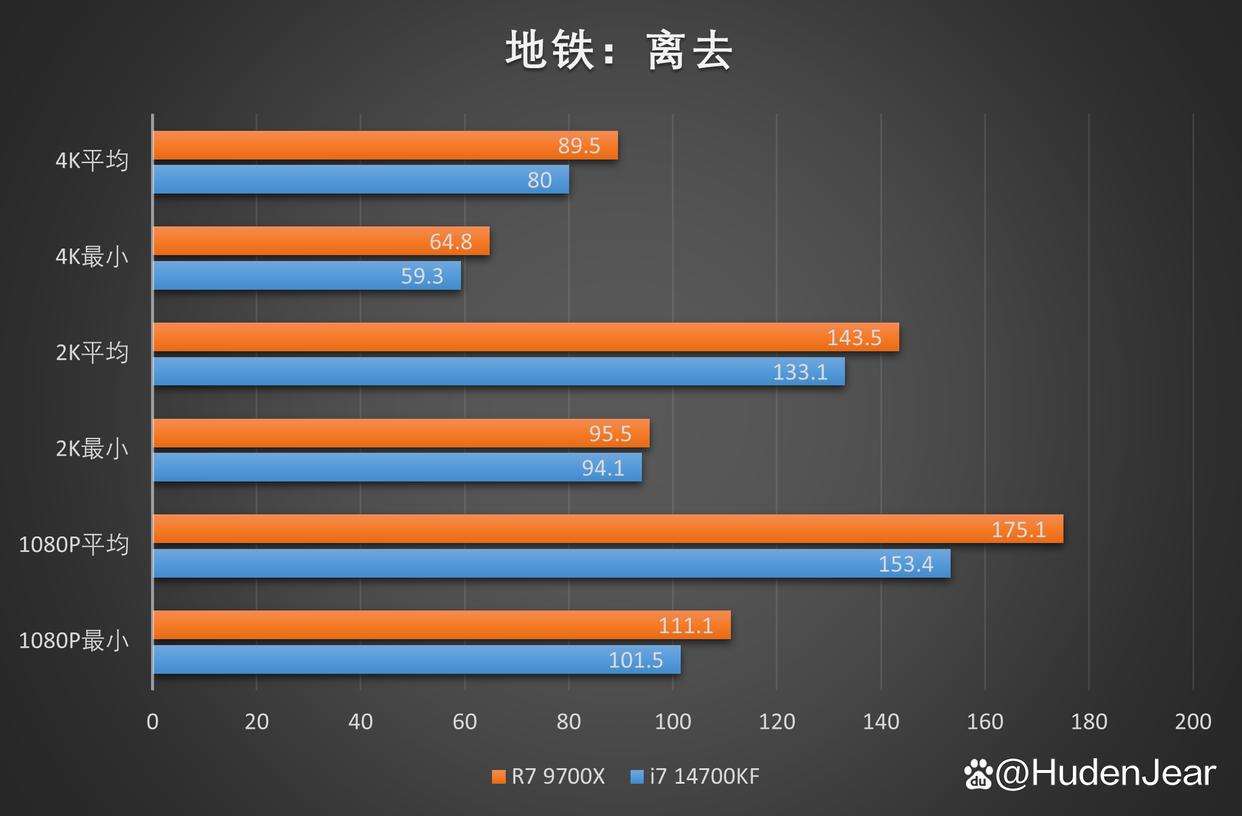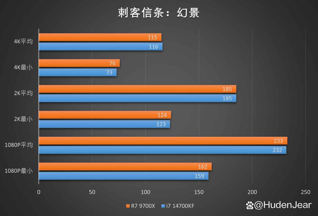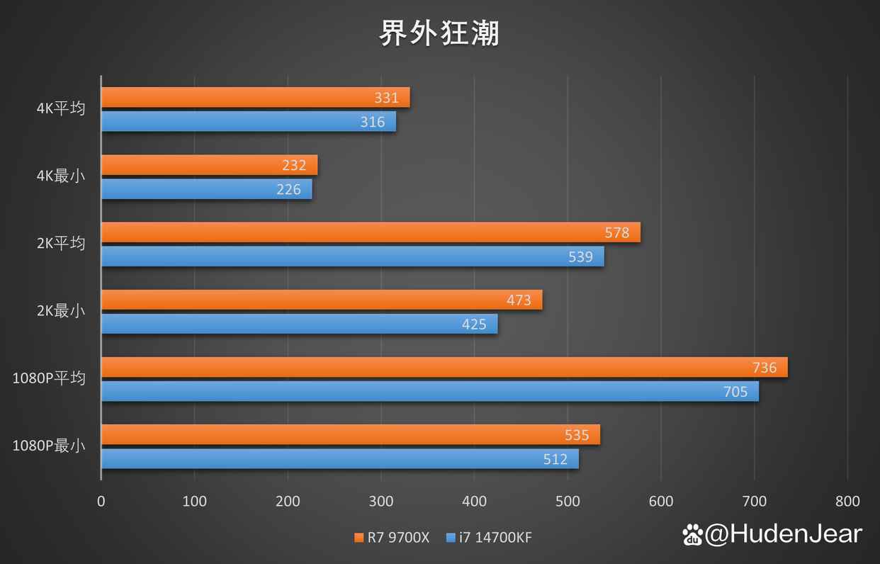 游戏测试里面基本都是一个趋势,那就是4K下R7 9700X和14700KF相比,R7大概率小胜一点,随着分辨率到2K和1080P,i7 14700KF基本没有赢面,沦为被R7 9700X爆杀的对象。这还只是9700X这样的桌面级,要是98X3D来了得飞起来